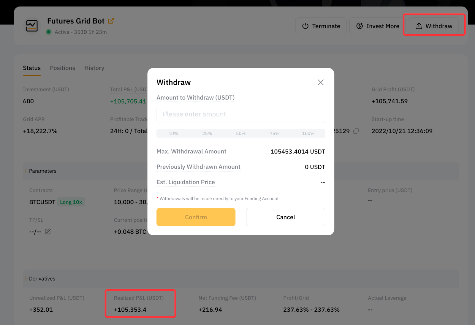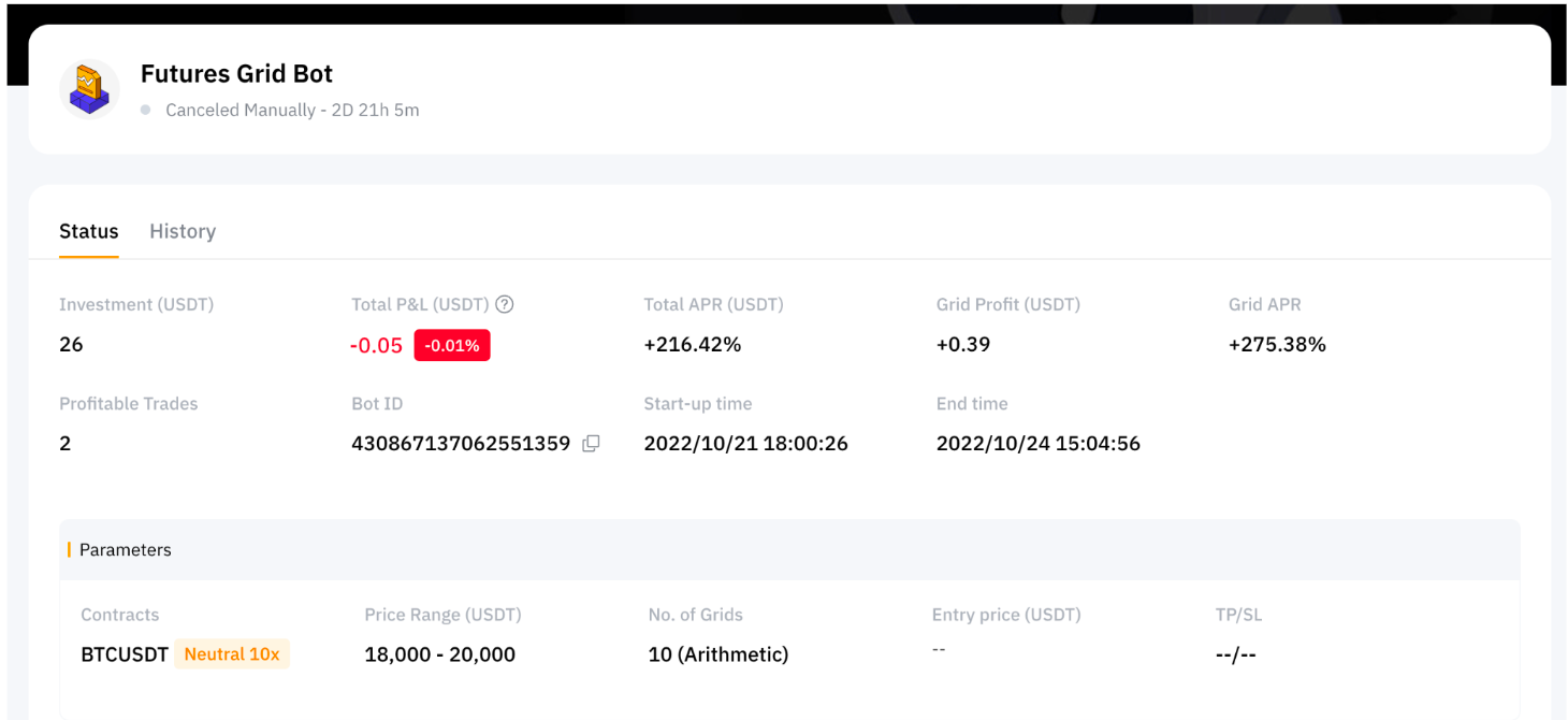 Todos los bots de trading se canalizarán directamente a través de la Cuenta de Financiación. Cuando cree un Futures Grid Bot, el sistema transferirá automáticamente el importe de la inversión desde su Cuenta de Financiación al Bot de Trading. Una vez finalizado el bot, el importe de la inversión y los beneficios (si los hubiera) se transferirán también a su cuenta de financiación.