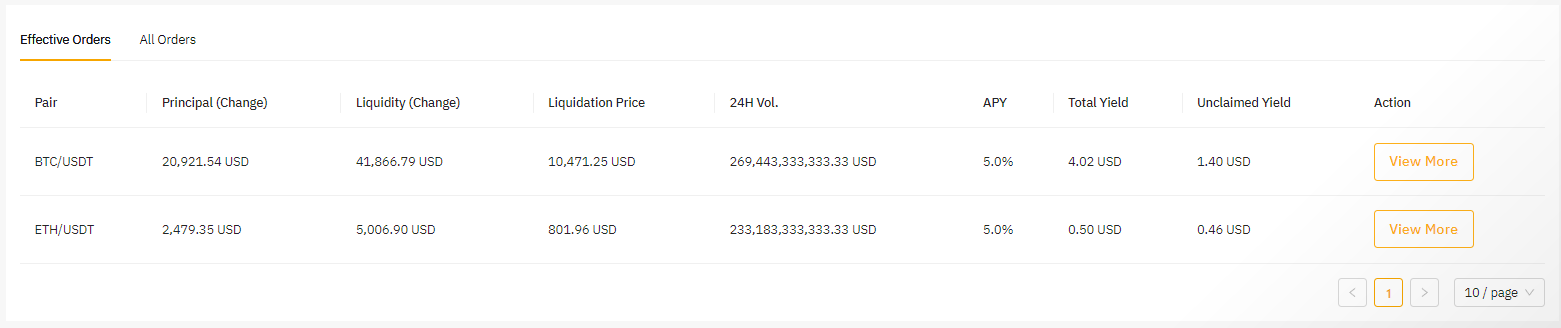 Órdenes efectivas: Puedes ver los detalles de las órdenes activas, incluyendo Par, Capital (Cambio), Liquidez (Cambio), Precio de liquidación, APY, Rendimiento total, Rendimiento sin reclamar y más.