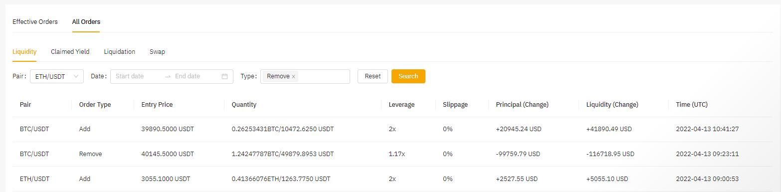 Todas las órdenes: Puedes consultar los detalles de todas las órdenes en las siguientes categorías: Liquidez, Rendimientos reclamados, Liquidación, Permutar, Par, Fecha y tipo.