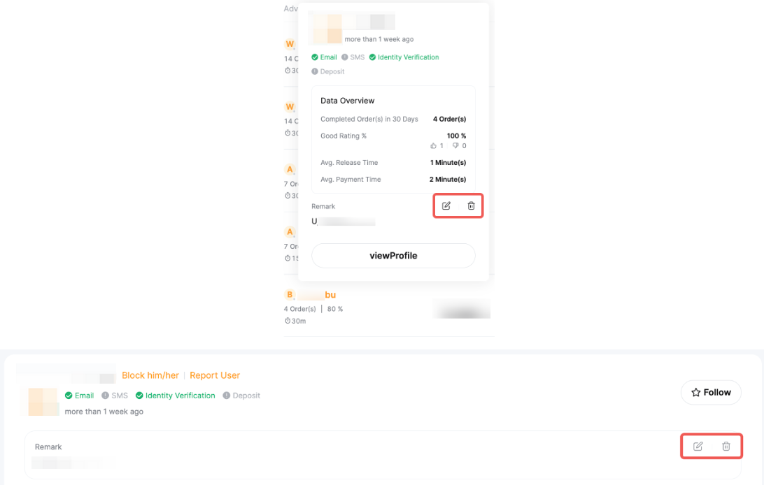 On the profile card or the profile page of the counterparty, click on the Edit or Delete icon to edit or delete the remark.