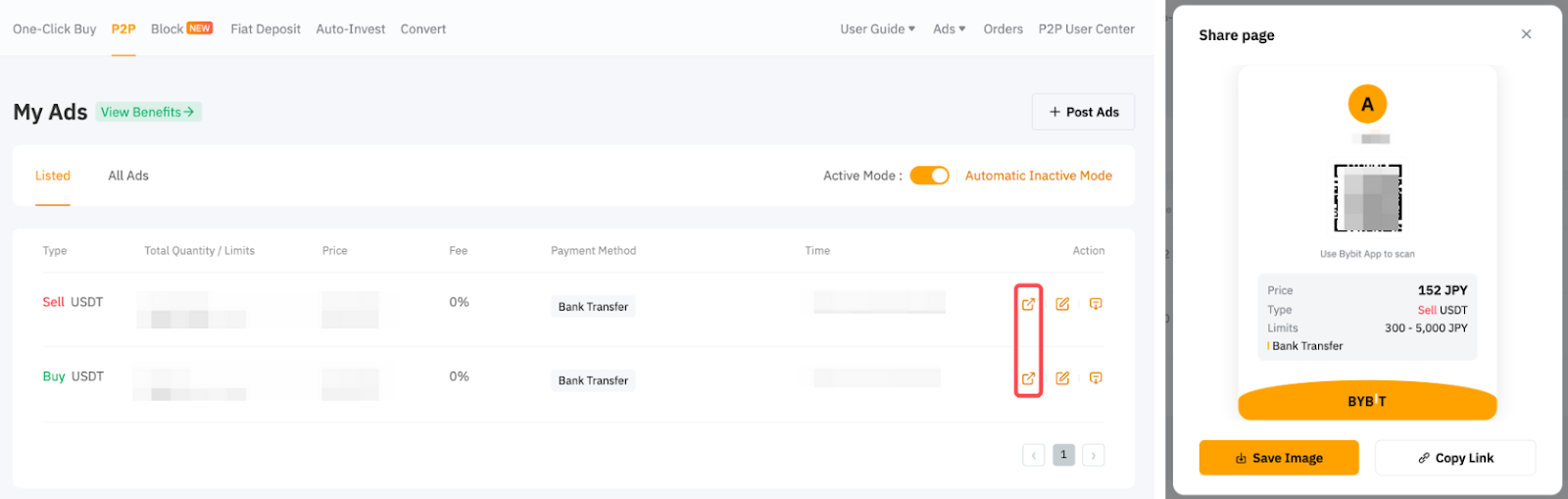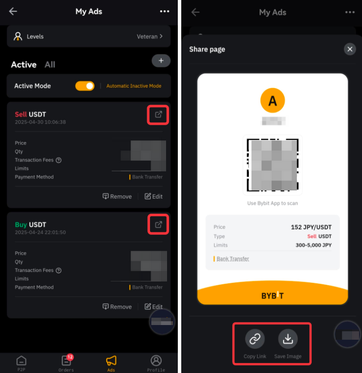 Puedes compartir tus anuncios a través de un código QR o un enlace URL. Los anuncios se pueden configurar como públicos o no públicos. Los anuncios públicos son visibles en la página de anuncios P2P, mientras que los anuncios no públicos solo son accesibles para los comerciantes que tienen el código QR o el enlace URL.