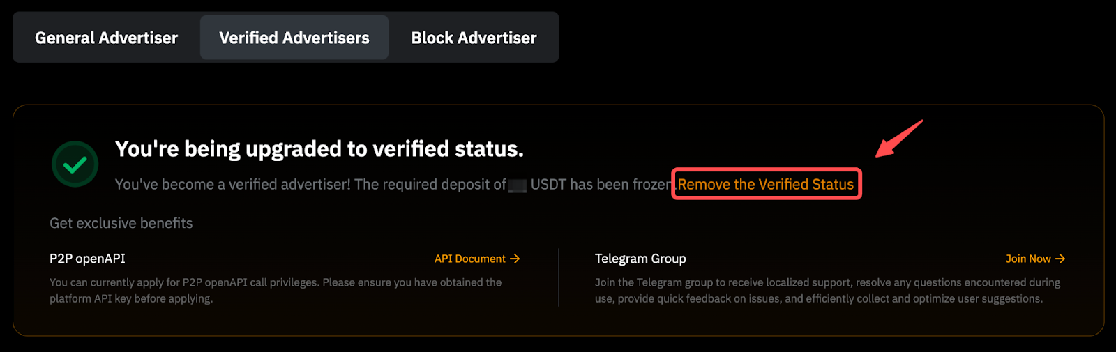 En el sitio web, simplemente vaya a Buy Crypto → P2P Trading → Ads → Advertiser Privileges y haga clic en Remove the Verified Status.