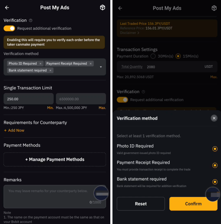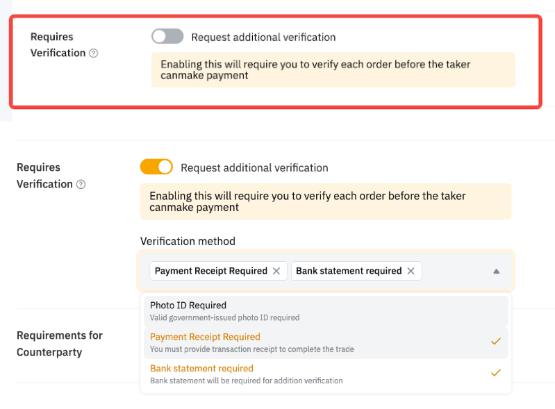 Sí, los anunciantes Verified y Block pueden establecer el requisito de verificación al publicar un anuncio. Puede encontrar más información sobre cómo publicar un anuncio comercial en P2P.