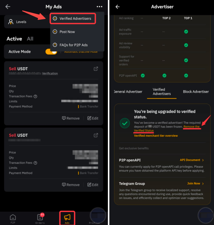 En la aplicación, vaya a la página de operaciones P2P → Anuncios, toque el icono de 3 puntos en la esquina superior derecha y seleccione Anunciantes verificados, luego haga clic en Eliminar el estado verificado.