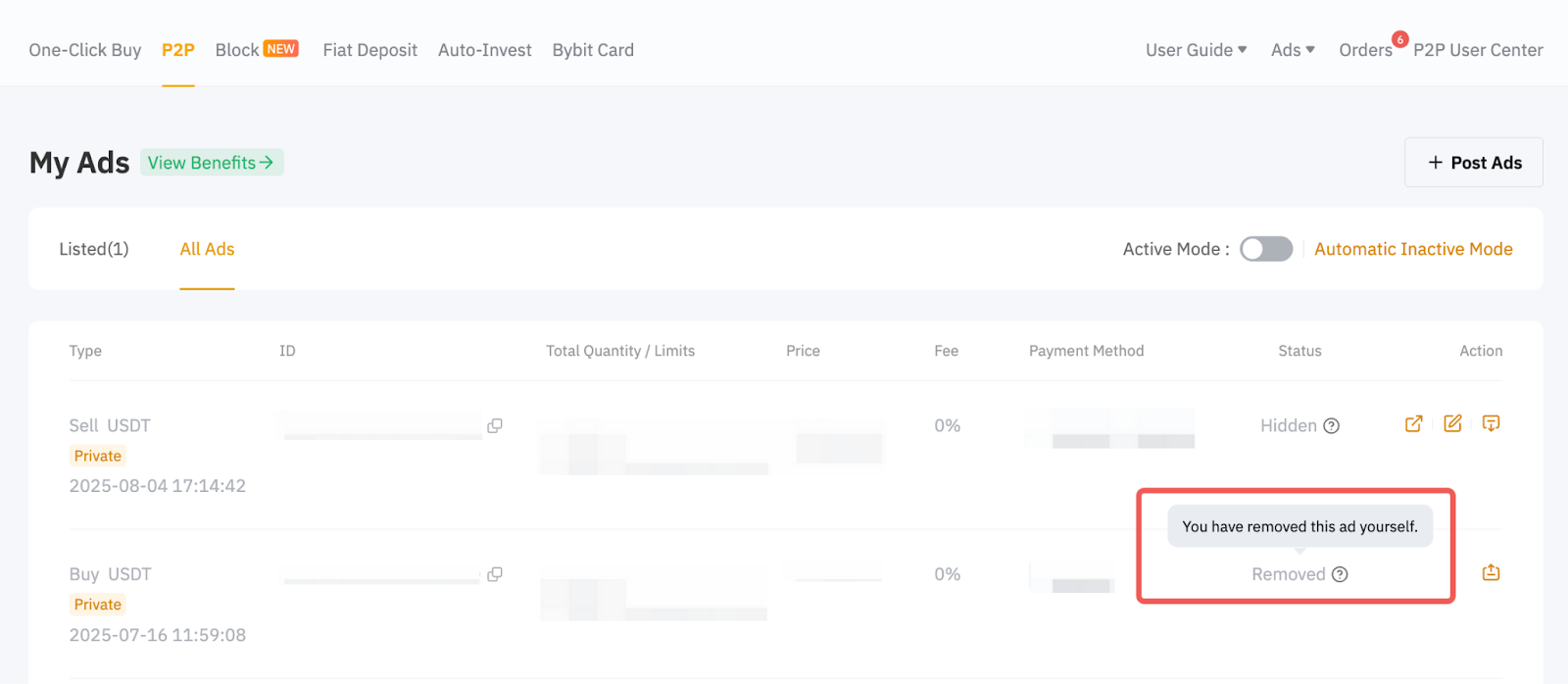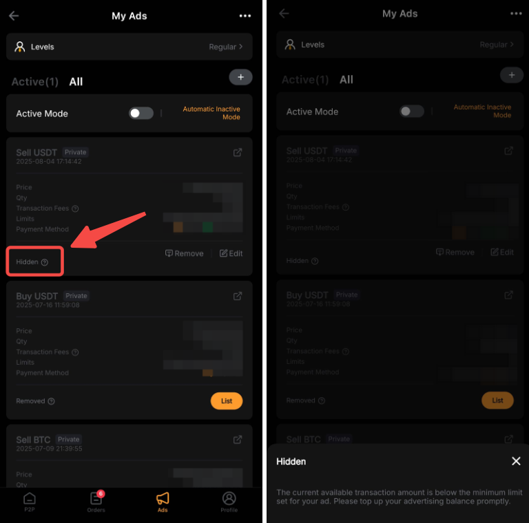 En la aplicación, ve a Trading P2P → AnunciosTodo para ver la lista de anuncios eliminados u ocultos. A continuación, haz clic en Estado para ver los motivos.