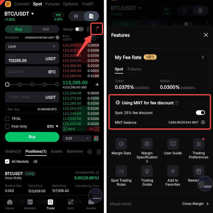 3. Spot Trading: haz trading con MNT contra otras criptomonedas en el mercado Spot. Puedes ejecutar órdenes de mercado o con límite y, quizá, obtener mejores precios que con la conversión instantánea. Obtén más información sobre el Spot Trading aquí.