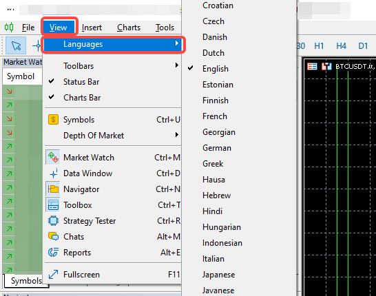 Para cambiar el idioma que se muestra en tu terminal de cliente MT5, simplemente haz clic en el menú Ver → Idioma y selecciona el idioma que prefieras en la lista disponible.