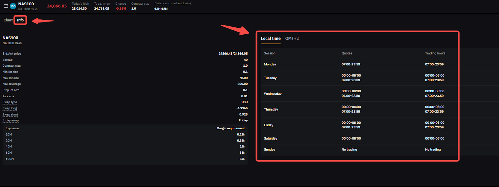 Para consultar el horario de trading, simplemente seleccione su símbolo de trading preferido en TradFi para que se le redirija a su página de trading. Puede ver el horario de trading de este símbolo específico haciendo clic en la etiqueta Info.