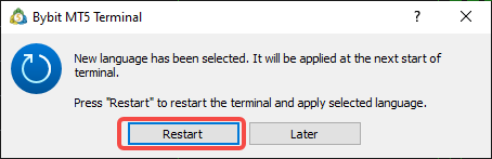 Una vez hecho esto, aparecerá un cuadro de diálogo que le pedirá que reinicie el terminal. Haz clic en Reiniciar y los nuevos idiomas se aplicarán una vez que se vuelva a abrir el terminal de cliente MT5.