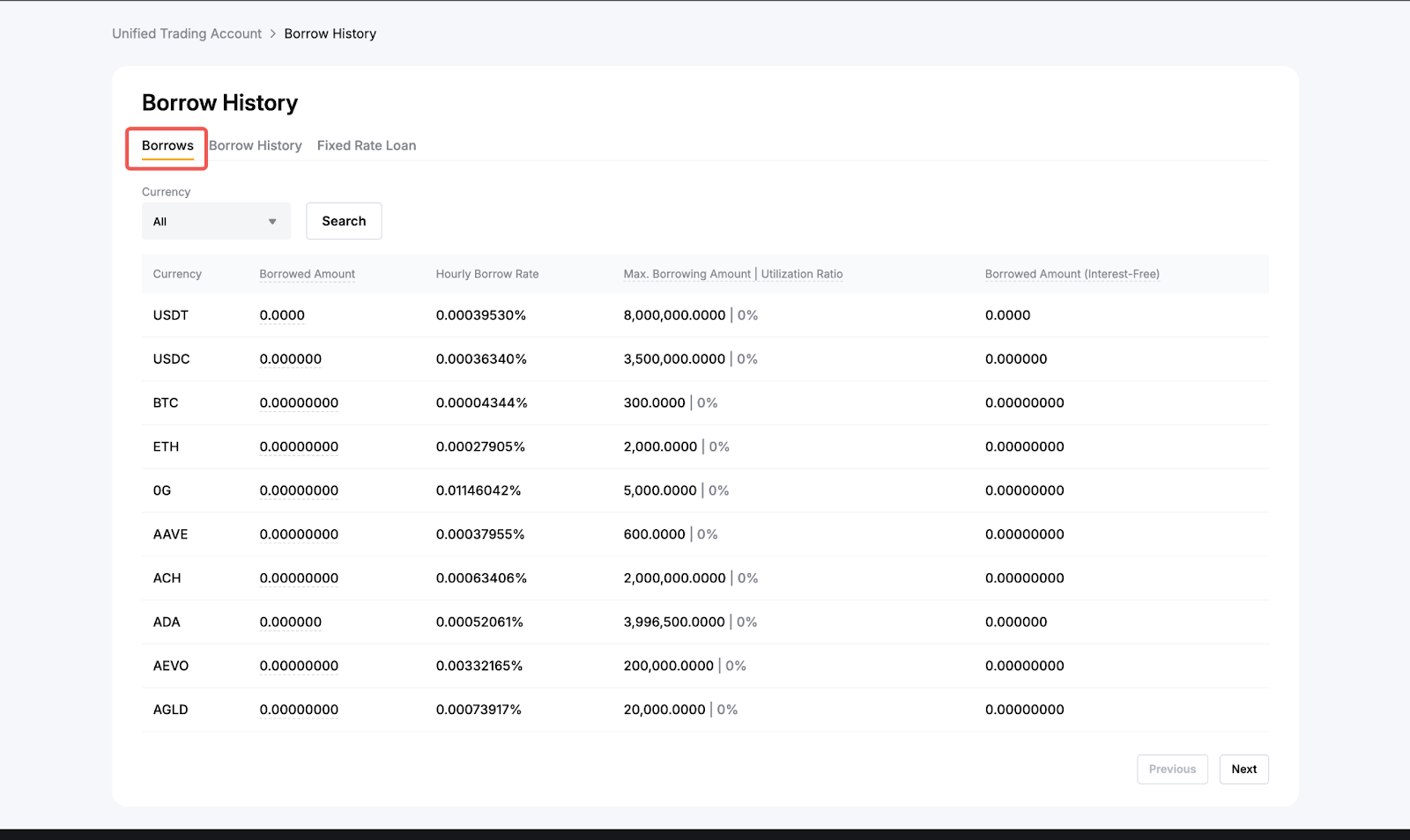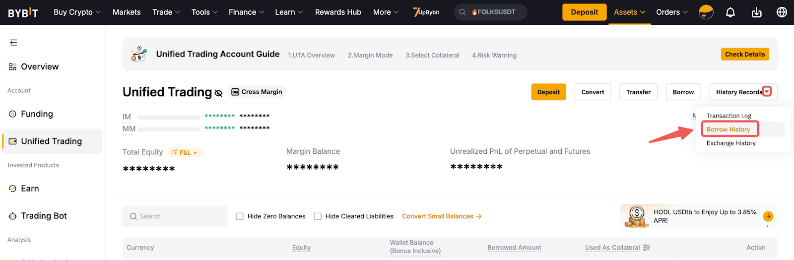 Como alternativa, vaya a Cuenta de trading unificada → Historial de registros → Historial de préstamos. Allí podrá ver su tasa de interés por hora y los detalles de su préstamo.