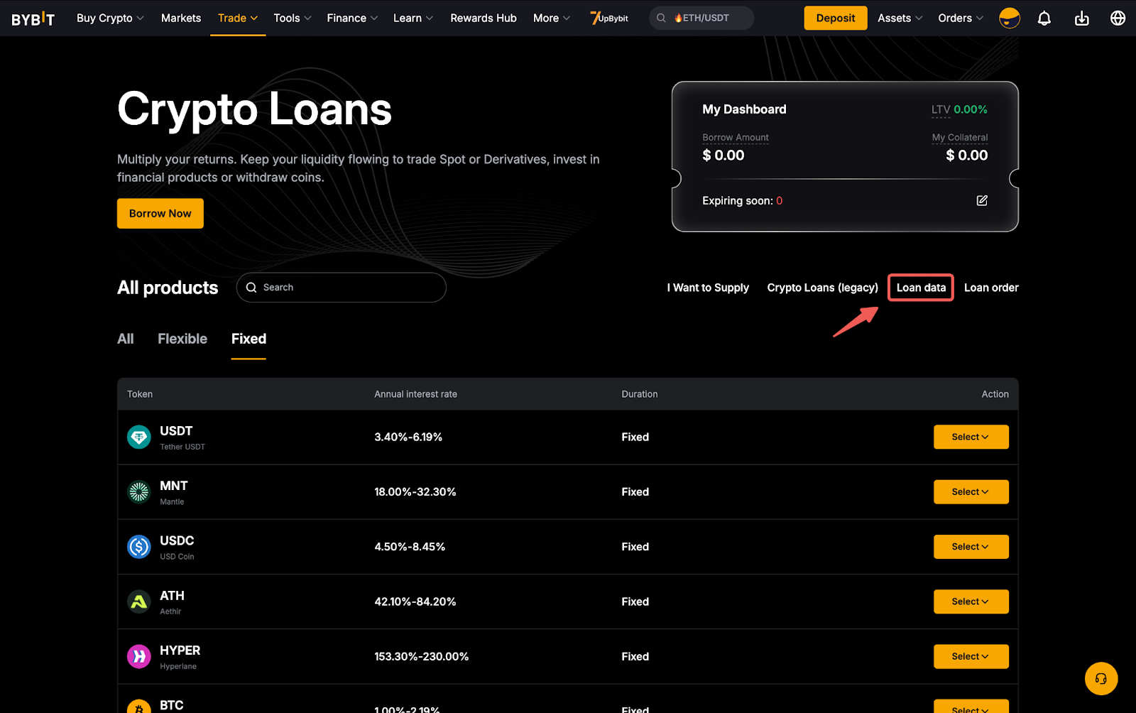 Todos los tipos de interés aplicables en Bybit pueden consultarse en la sección Préstamos tomados y Préstamos hechos de la página de visión general del mercado de Bybit, pero también existe un acceso directo a estos datos desde las páginas de los productos.