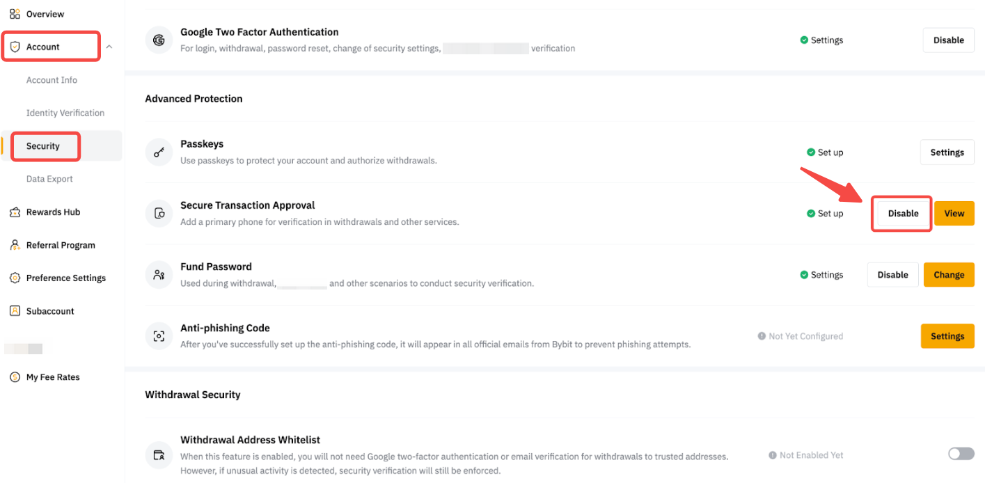 Paso 1: Haz clic en tu foto de perfil en la esquina superior derecha, luego ve a Cuenta → Seguridad → Protección avanzada. En Protección avanzada, haz clic en Deshabilitar junto a Aprobación segura de transacciones.