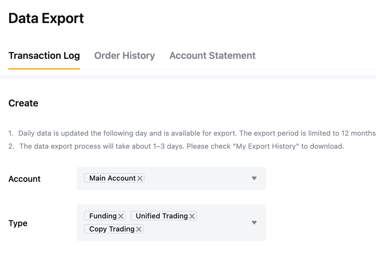 Para importar datos a través de un archivo CSV, ve a la página Exportación de datos de tu cuenta de Bybit y asegúrate de recuperar la siguiente información: