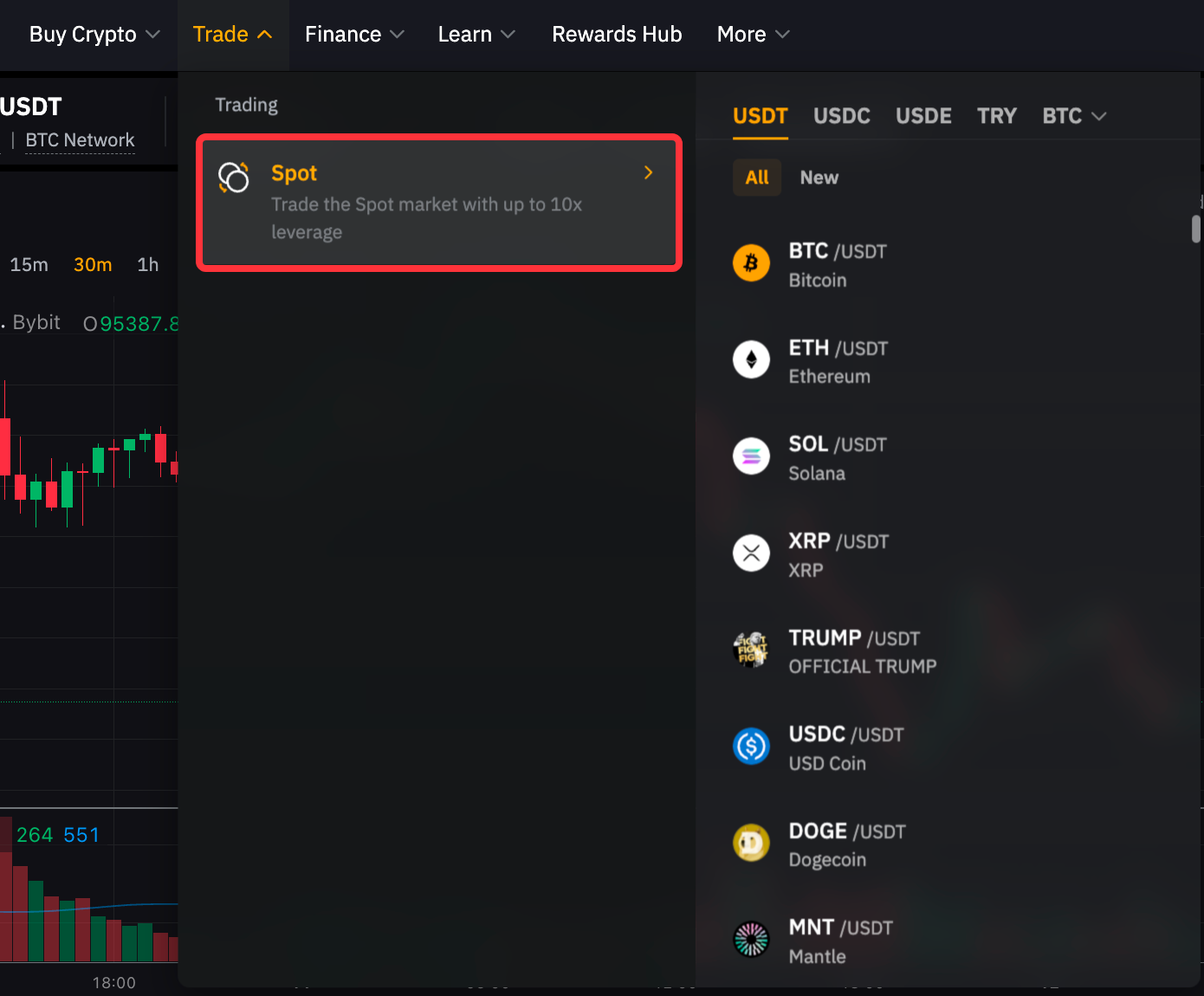Paso 1: Inicia sesión en tu cuenta y haz clic en Trade → Spot en la barra de navegación superior para acceder a la página de trading spot.