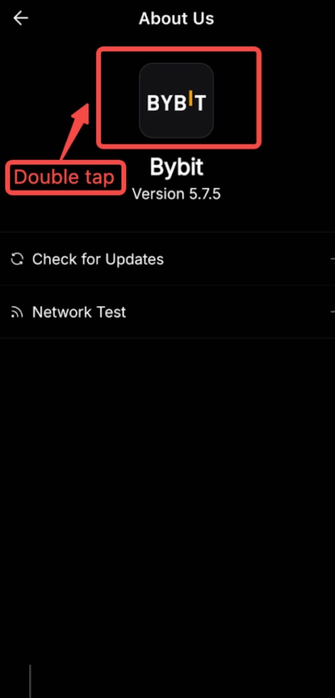 Paso 5: Puedes presionar dos veces en el logo de Bybit para ver más información sobre la versión de la aplicación.