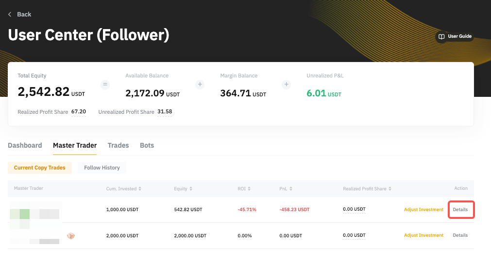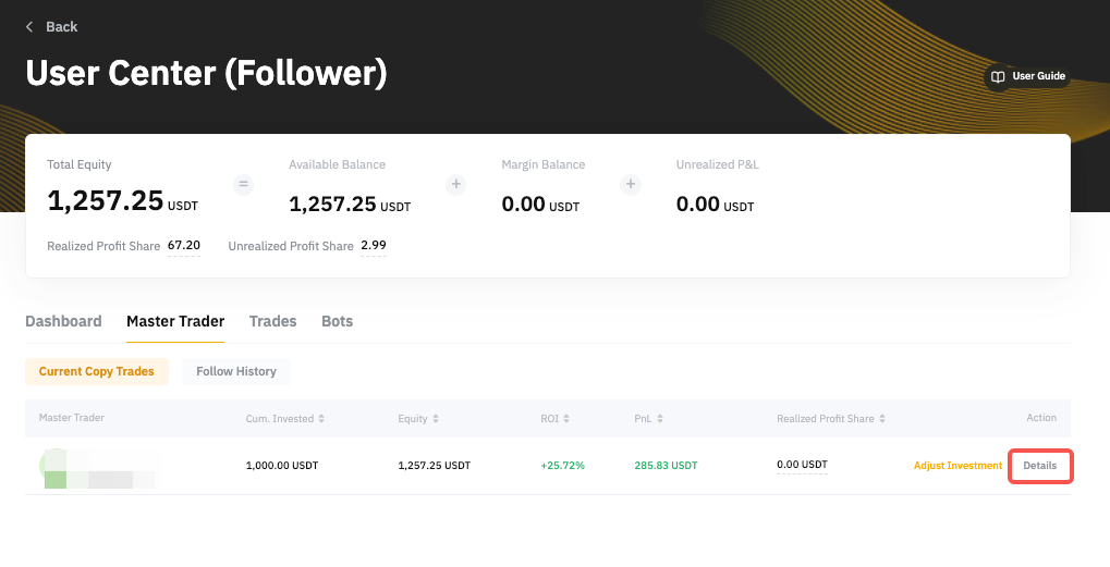 Para cancelar la copia de tu master trader, ve al Centro de usuarios (seguidor) → Master Trader → Copy trades actuales y haz clic en los detalles del master trader respectivo que deseas dejar de seguir.