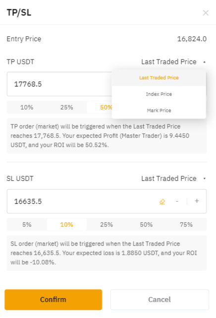 La barra de porcentaje debajo del precio se refiere al ROI que se alcanzará. Por ejemplo, el seguidor A ha seleccionado el 10 % para stop loss y el último precio de trading como precio de referencia. El sistema ha calculado automáticamente 16 635,5 USD como precio de stop loss. Esto significa que cuando el último precio de trading alcance los 16 635,5 USD, se activará la orden SL y su ROI será de aproximadamente -10 %.