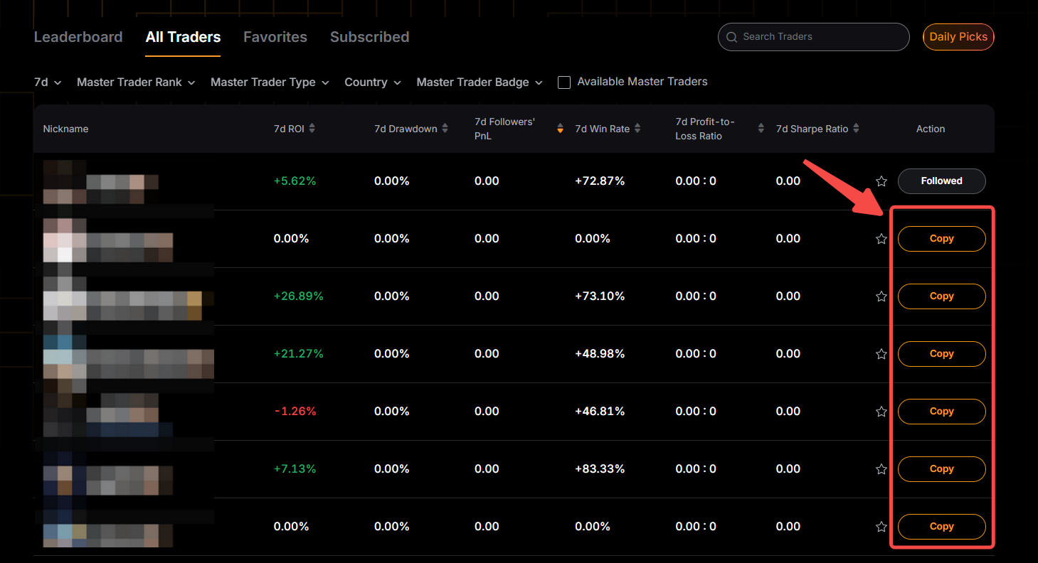 Paso 2: haz clic en Copiar en la parte inferior de la tarjeta del master trader al que deseas seguir para entrar en la página de configuración de copy trading classic. Los seguidores pueden copiar hasta 10 master traders simultáneamente.