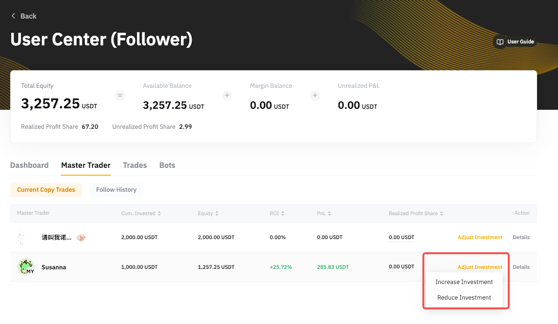 Paso 1: ve a Centro de usuarios (seguidor) → Master Traders → Ajustar inversión. A continuación, haz clic en Aumentar inversión o Reducir inversión.