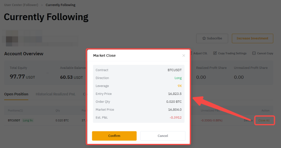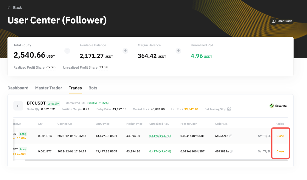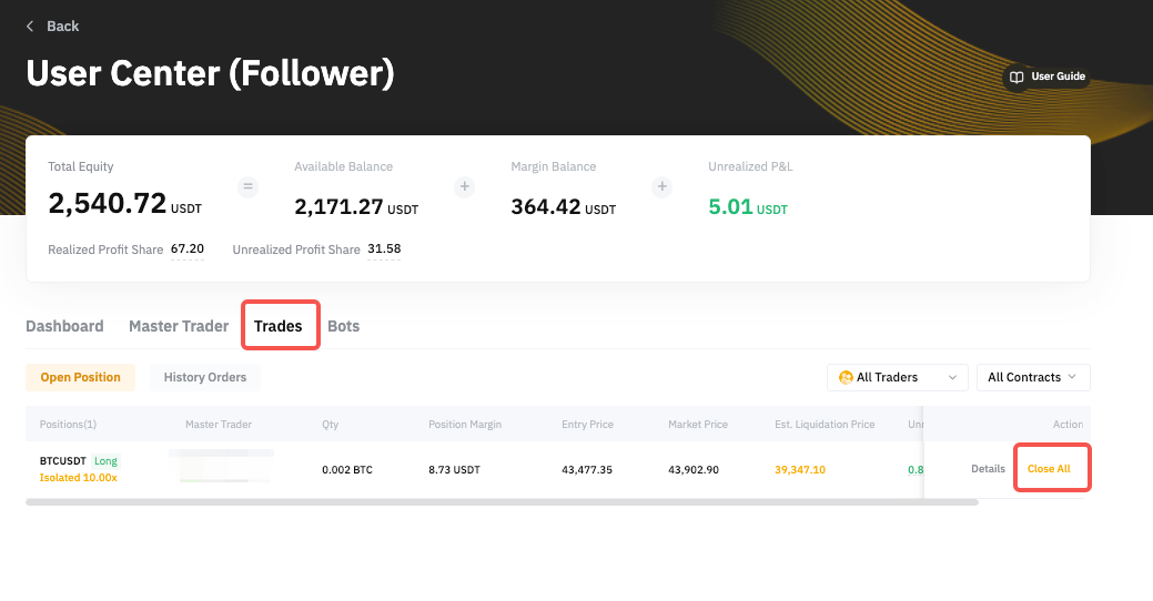 Si deseas cerrar la posición completa basada en tu master trader, ve al Centro de usuarios (seguidor) → Trades → Posición abierta → y haz clic en Cerrar todo para cerrar la posición completa a precio de mercado.