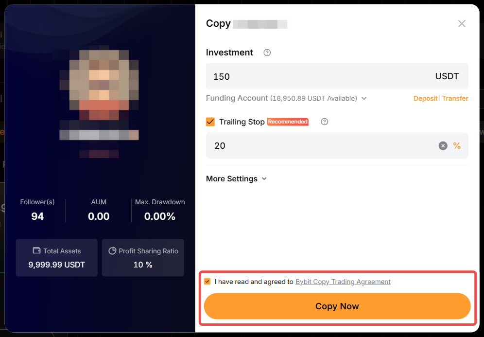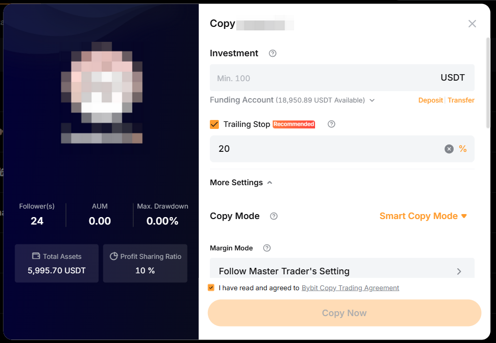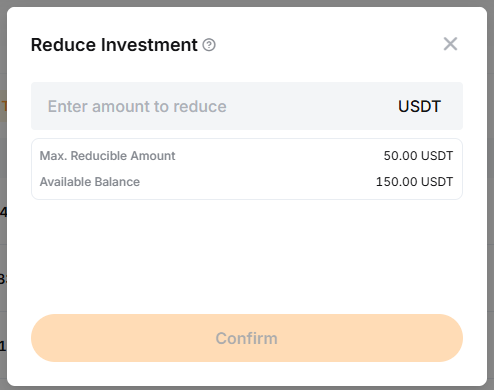 — Por lo general, el importe mínimo de inversión en copy trading classic es de 100 USDT. Sin embargo, tu master trader puede establecer un importe mínimo de inversión requerido más alto. Por lo tanto, no podrás reducir tu inversión a menos de 100 USDT o la cantidad requerida por tu master trader.