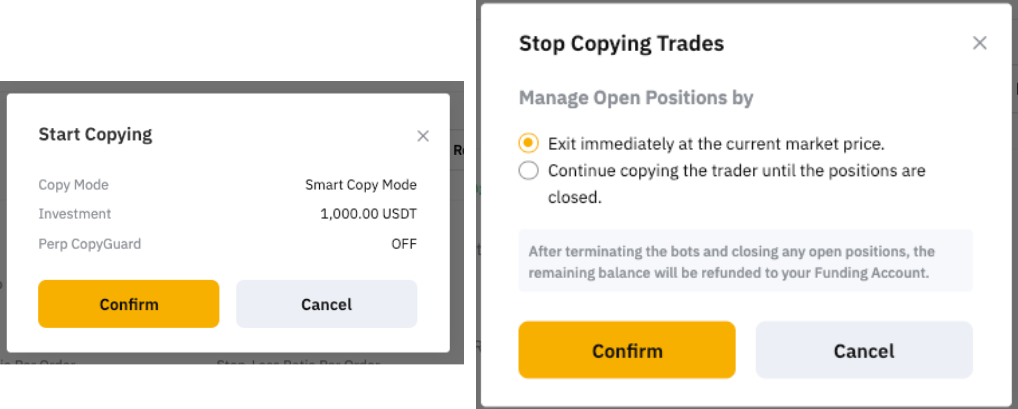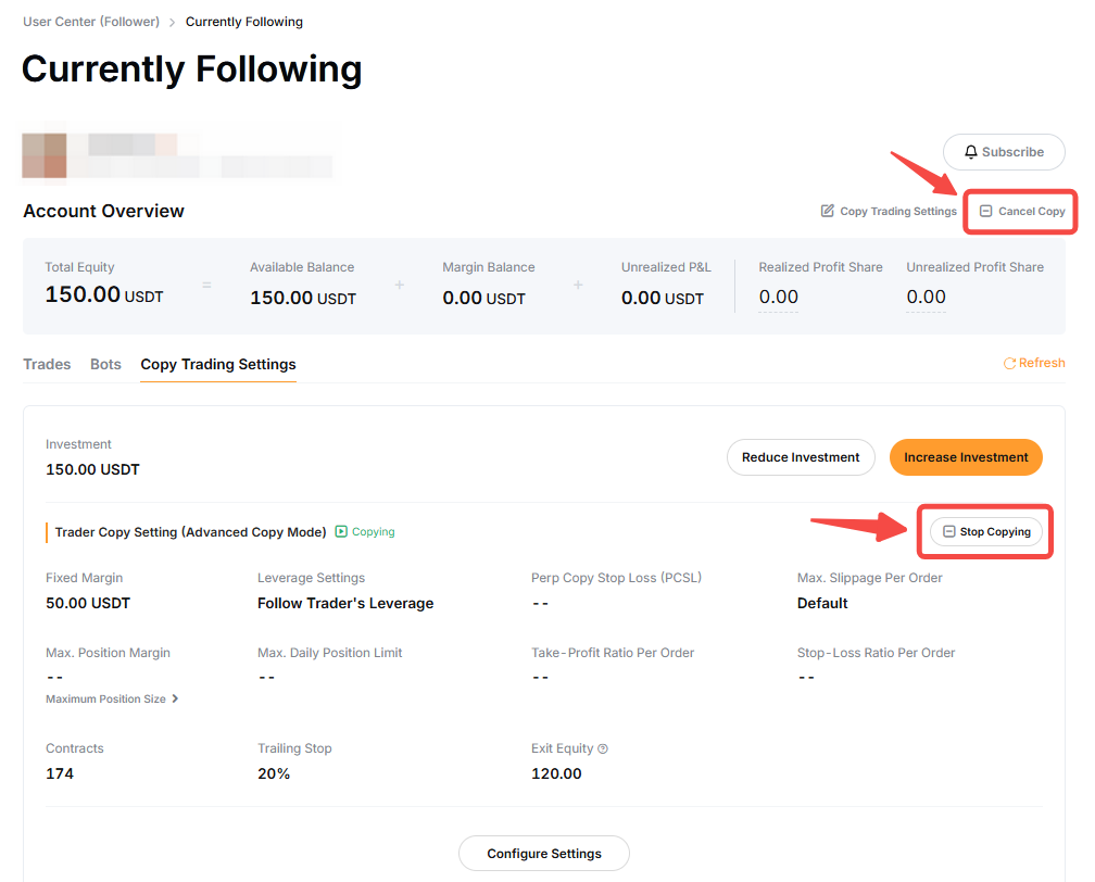 Para cancelar todos los elementos copiados, ve a la página de configuración de Copy trading classic y haz clic en Cancelar copia en la esquina superior derecha. Si deseas cancelar elementos específicos, puedes hacer clic en Detener copia junto a la Configuración de copia del trader.