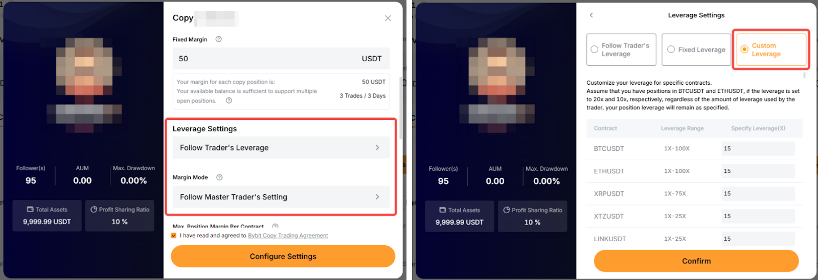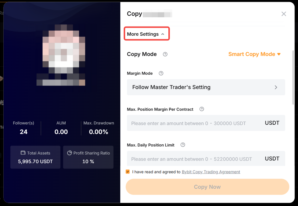 Modo de margen y ajustes de apalancamiento: para cambiar el modo de margen o el apalancamiento, puedes consultar los pasos anteriores sobre cómo editar tu configuración de copy trading. El cambio en el apalancamiento no se aplica al modo Smart copy, ya que seguirás el apalancamiento del master trader.