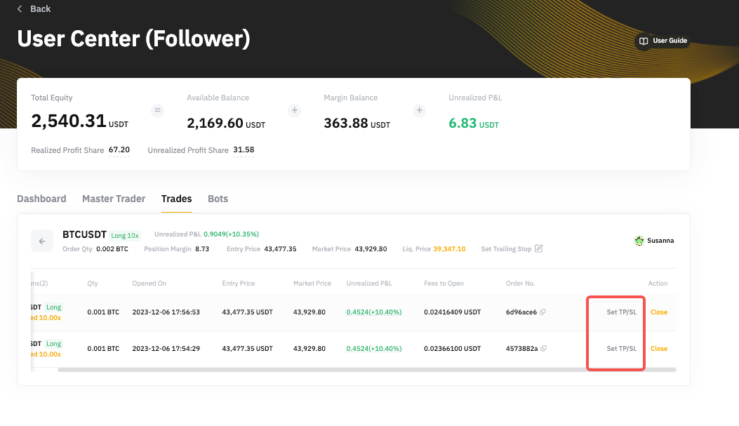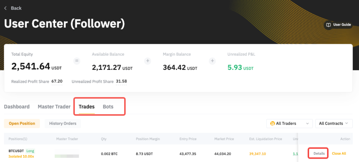 Paso 2: ve a la pestaña de Trades para ver todos tus trades de perpetuos de USDT copiados.