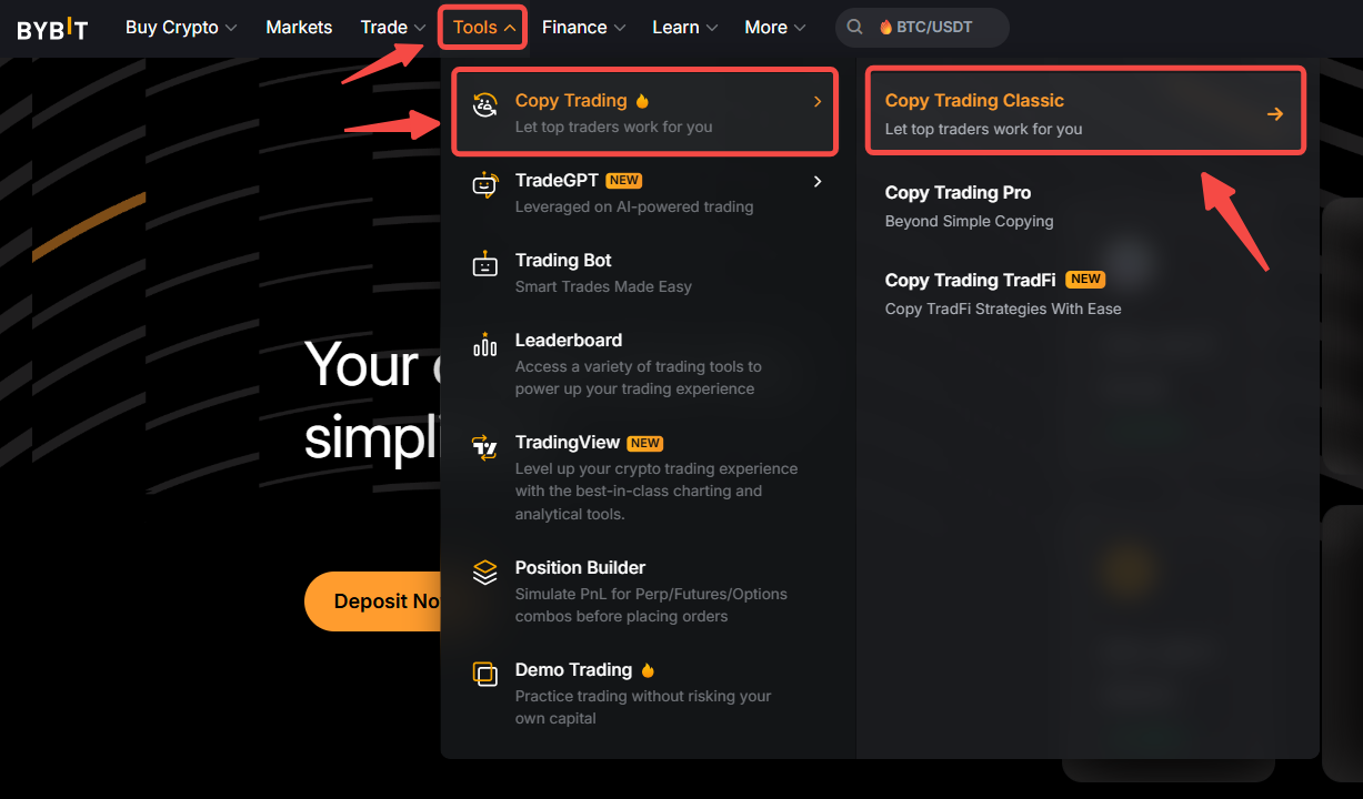 Paso 1: haz clic en Herramientas Copy trading en la barra de navegación para acceder a la página de copy trading Classic.