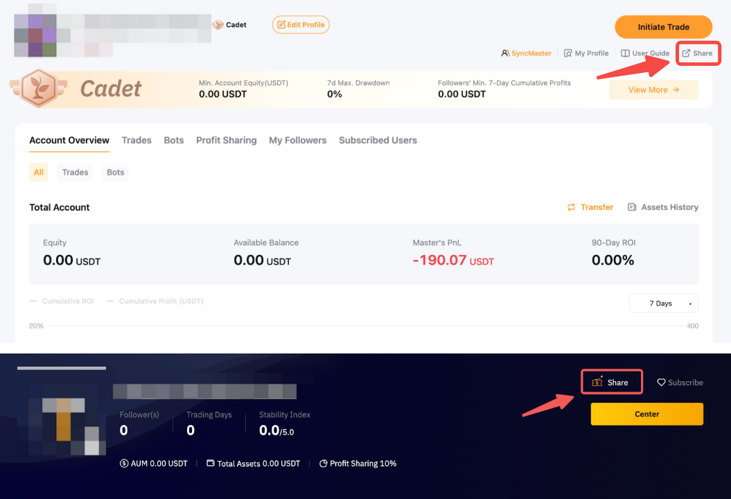 Para compartir su perfil, haga clic en el botón Compartir ubicado en la esquina superior derecha de la página del Centro de Trader. También puede hacer clic en Compartir en la página Cartera de Master Trader.