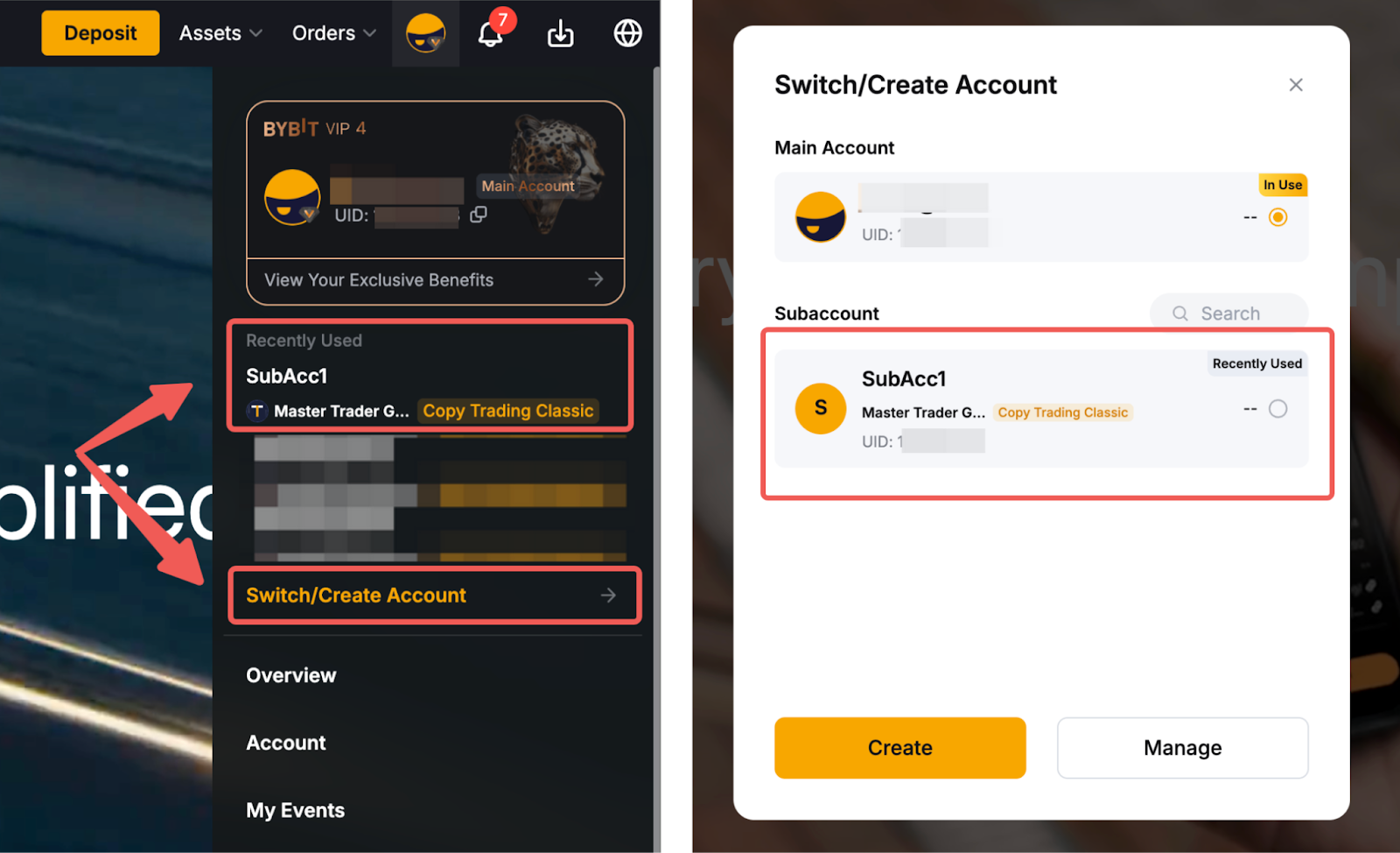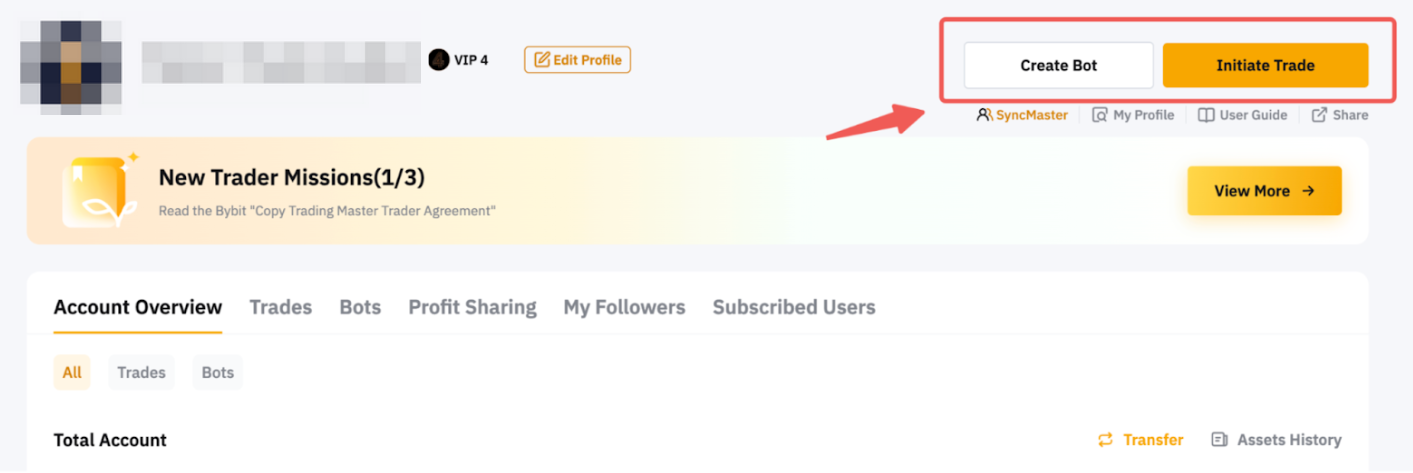 En la página de inicio de Bybit, desplace el cursor hasta su perfil y haga clic en el botón Cambiar/Crear cuenta. A continuación, haga clic en la subcuenta Master Trader disponible de la selección para acceder a la página Master Copy Trading.