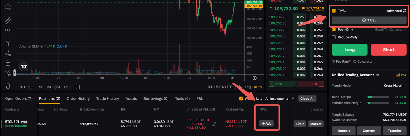 Para establecer un TP/SL para sus órdenes al crear el orden, simplemente haga clic en la opción Tomar beneficios/Detener pérdida en la zona de órdenes cuando cree su orden. Como alternativa, puede establecer un TP/SL para su posición abierta desde la pestaña Posición. Para obtener más información, consulte aquí.