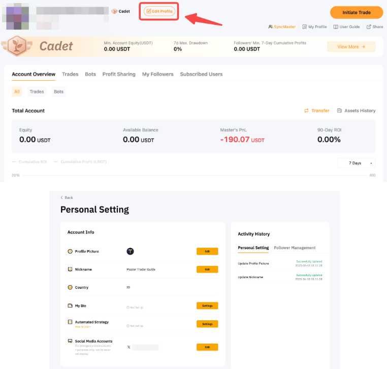 Para ir a su página de configuración personal, haga clic en Mi transacción de copia → Editar perfil para administrar su información de cuenta, configuración de seguidor y configuración de privacidad. Tenga en cuenta que cualquier actualización de la información de la cuenta necesitará de 1 a 3 días hábiles para su aprobación.