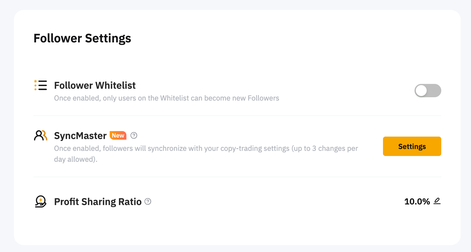 En Configuración de seguidor, puedes administrar tu lista blanca de seguidores, SyncMaster y relación de participación en los beneficios.