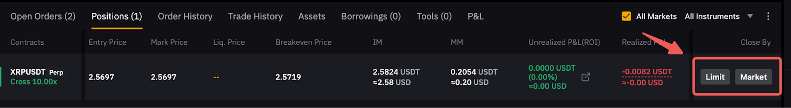 Para cerrar una posición, vaya a la pestaña Posiciones y puede cerrar por Límite u Orden de mercado. Si desea cerrar utilizando otras estrategias, como un orden condicional, puede utilizar nuestra función TP/SL integrada (para el modo de cobertura) o colocarla desde la zona de orden en el modo unidireccional.