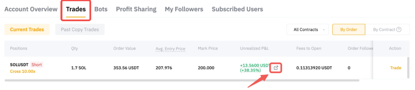En la página Centro del comerciante, puede ver los detalles del orden por orden o por contrato. En la pestaña Por orden, muestra los órdenes realizados por cada comerciante maestro respectivo. En la pestaña Por contrato, todas las órdenes de los mismos pares de trading abiertos en la misma dirección se consolidan en una posición. La posición Precio medio de entrada, Cantidad de orden, Precio de marca y Precio de liquidación se muestran desde la perspectiva de la posición. Solo se restablecerá cuando la dirección respectiva de la posición esté completamente cerrada.