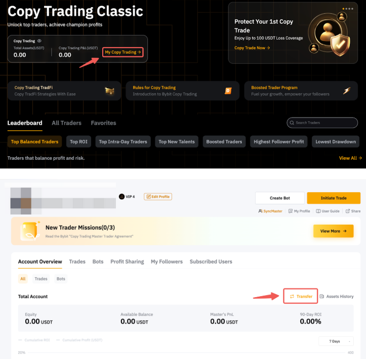 Paso 2: Si entra por primera vez en la página de operaciones de copy trading para iniciar una operación, haga clic en Mi operaciones de copy trading(operador maestro) → Transferir para realizar un depósito.