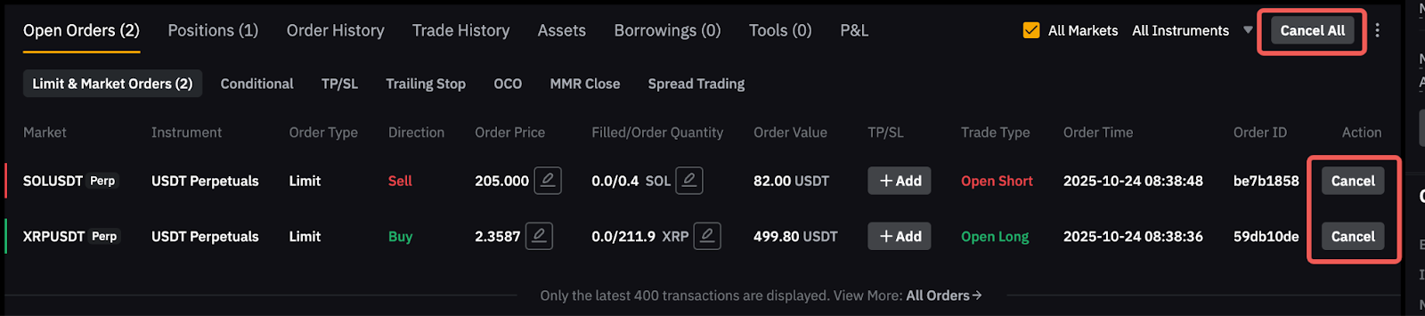 Para cancelar su orden, puede ir a la pestaña Abrir órdenes en la página Negociación perpetua.