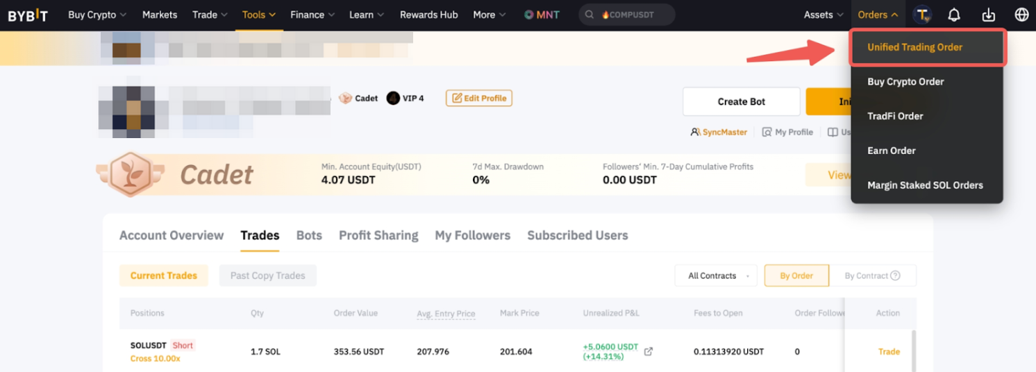 Las pérdidas y ganancias no realizadas en ambas pestañas se calculan en función del precio medio de entrada. Para ver el historial de cada orden, vaya a la página Orden de compraventa unificada. Para obtener más información, consulte las Preguntas frecuentes: Copy Trading.