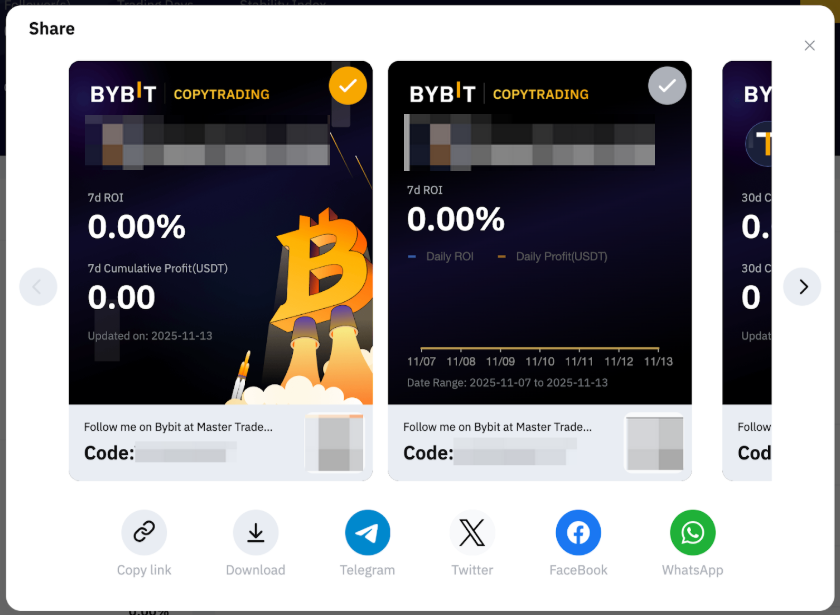 Al hacerlo, puede compartir su rendimiento de trading en cuentas de redes sociales como Telegram, Twitter, Facebook y Whatsapp con un solo clic.