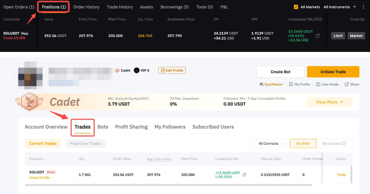 Puede ver los detalles de la posición u orden en la página de trading perpetuo de USDT o en la página del Centro de comerciantes (Máster trader) → Operaciones. Ambas páginas presentarán los datos del same.