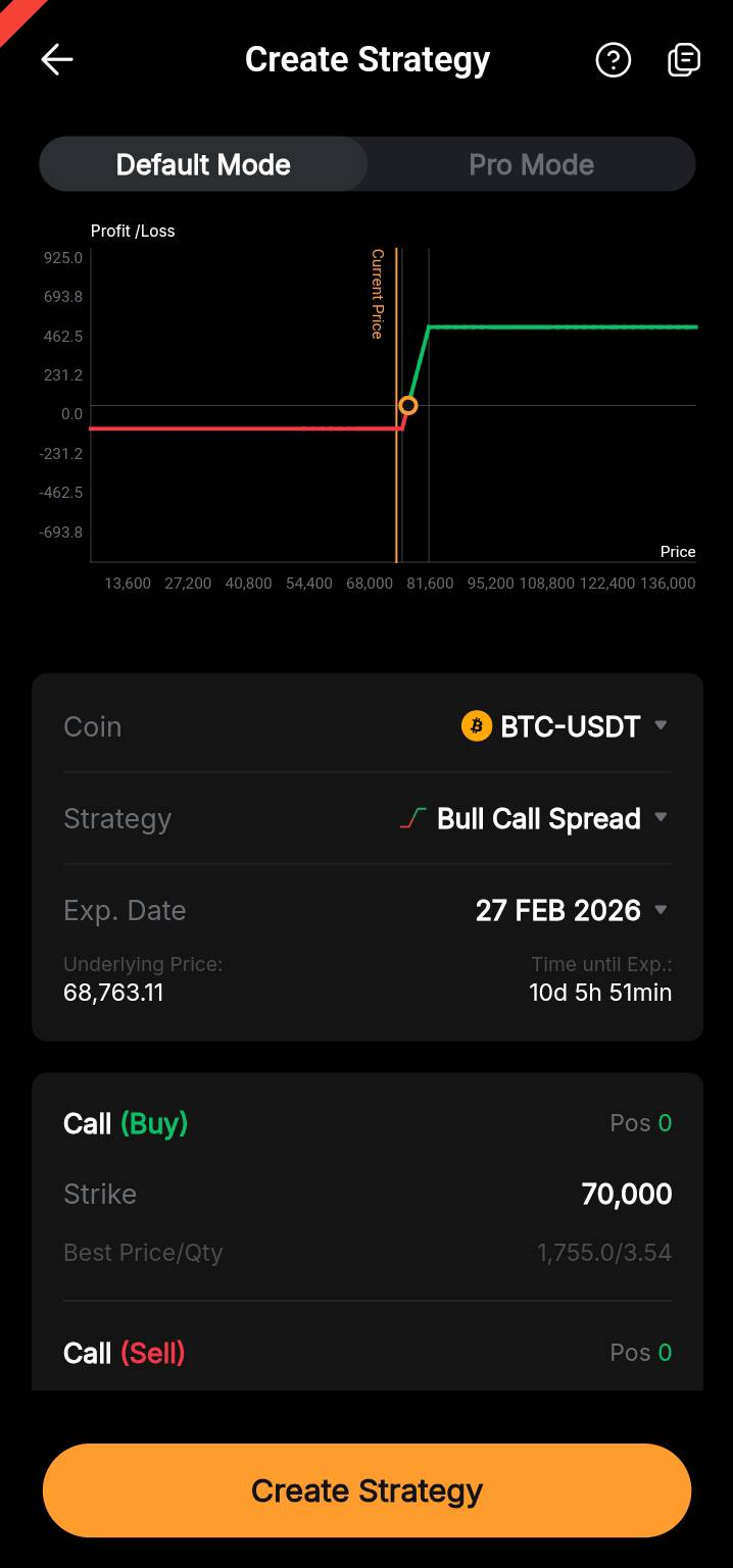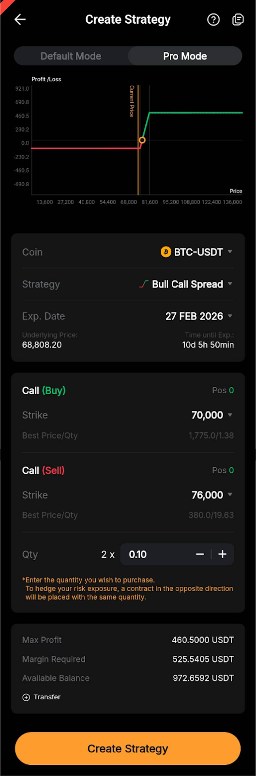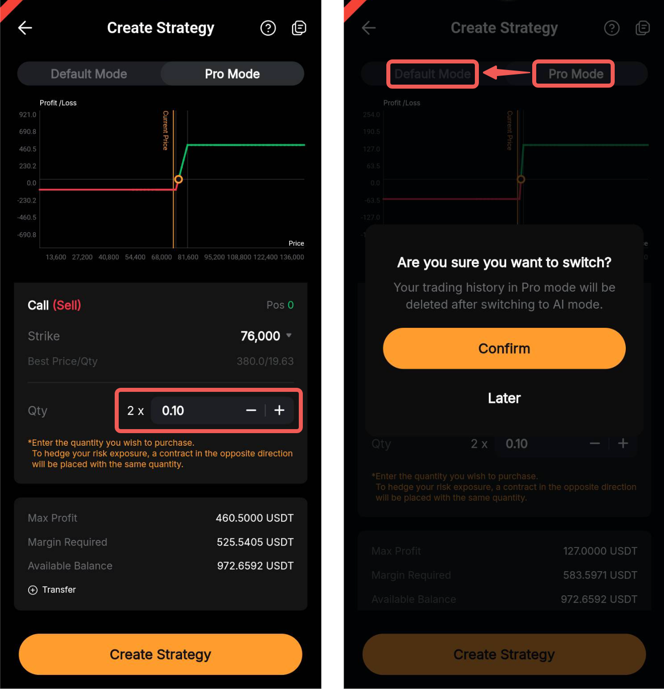 El Modo Pro es adecuado para inversores con experiencia en el trading de opciones. En la página Crear estrategia , se proporcionan los parámetros de estrategia predeterminados.