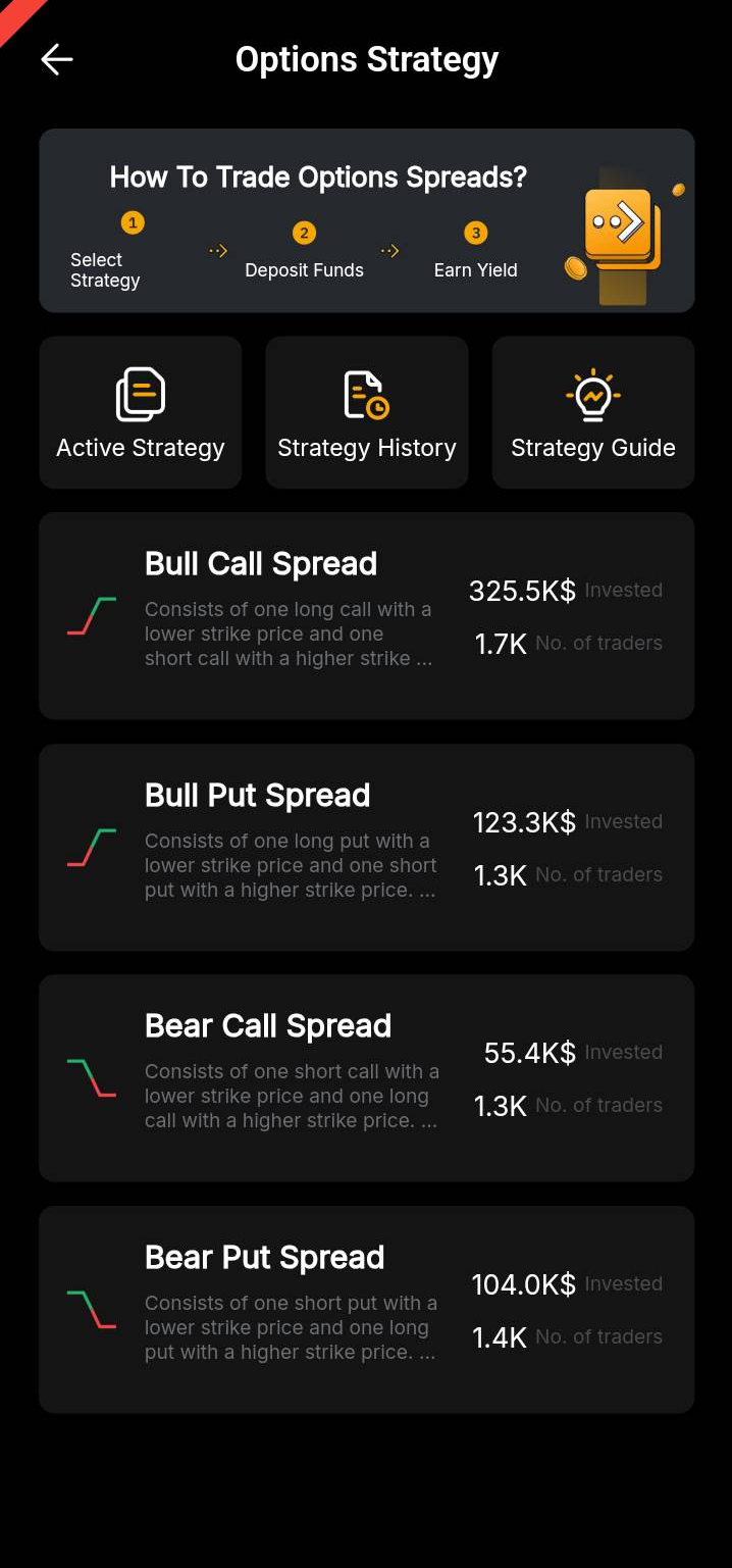 Actualmente, hay cuatro estrategias entre las que los usuarios pueden elegir: Spread de compra alcista, Spread de venta alcista, Spread de compra bajista y Spread de venta bajista. Los detalles son los siguientes: