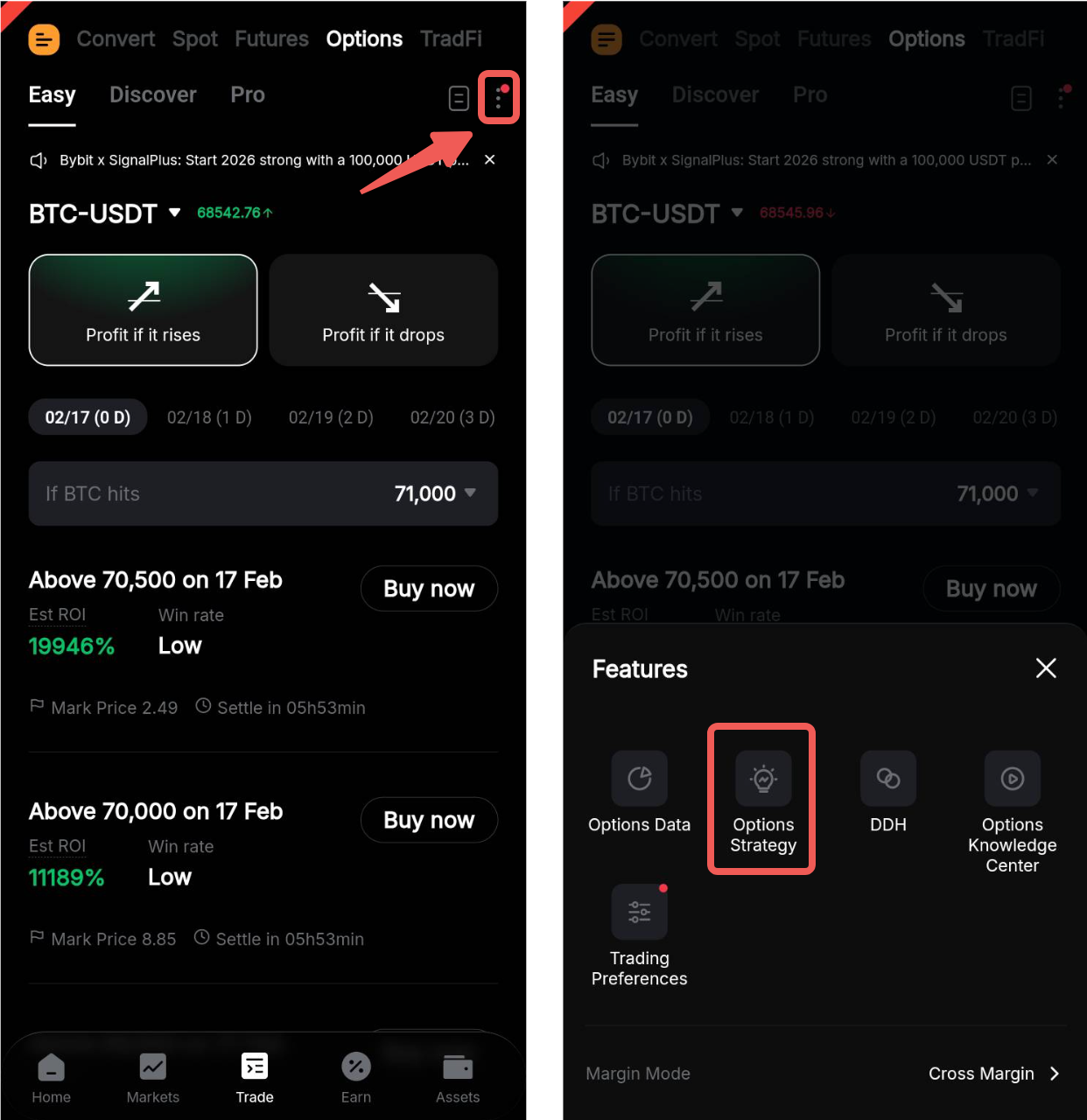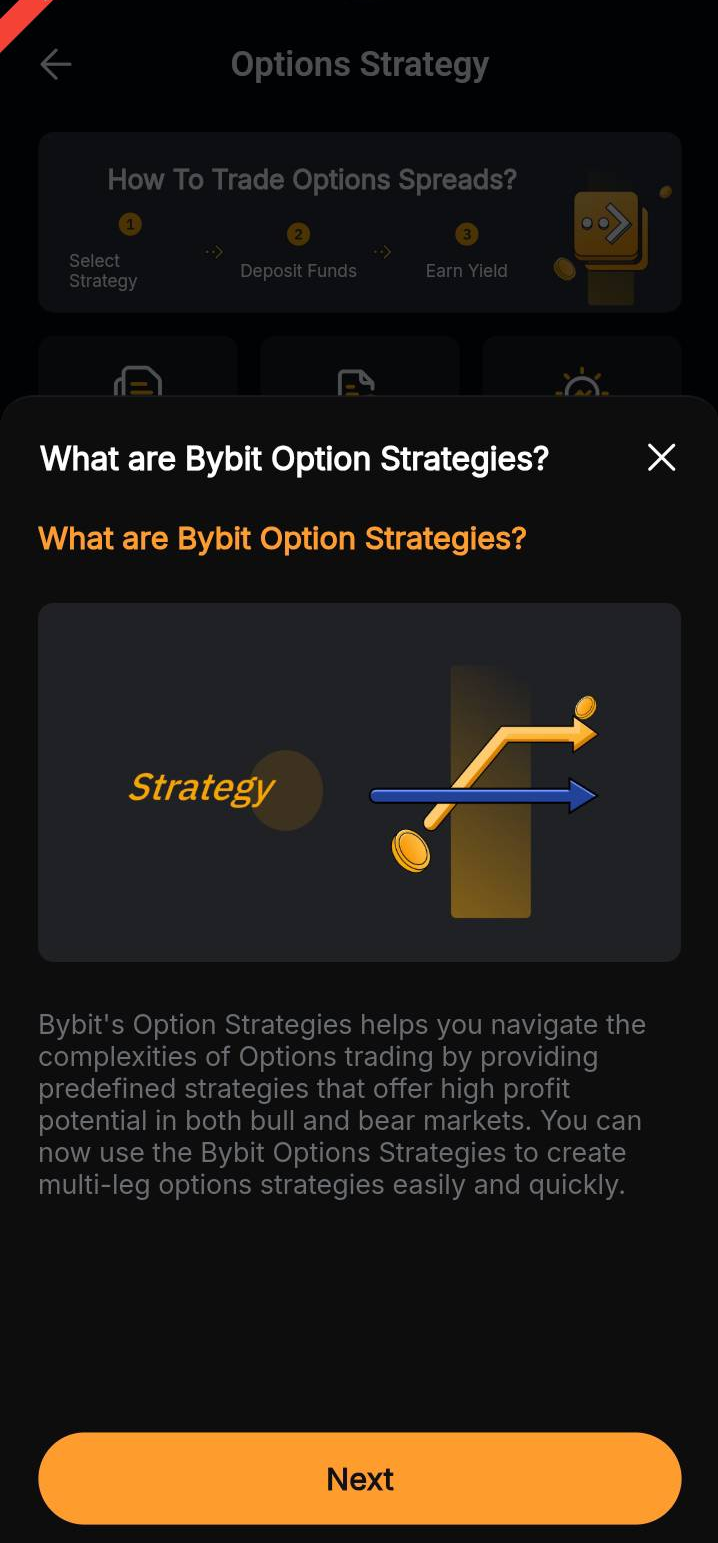 La función Estrategia de opciones de la aplicación de Bybit ofrece preajustes de trading personalizables para invertir fácilmente en mercados de opciones en alza y en baja. Con esta función, puede realizar varias estrategias de trading de opciones largas y cortas a través de operaciones sencillas.
