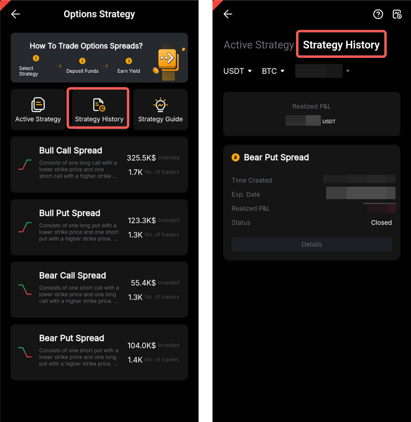 Las estrategias de opciones cerradas se pueden consultar en Historial de estrategias. Localice las estrategias que desea ver estableciendo filtros de moneda y/o tiempo.