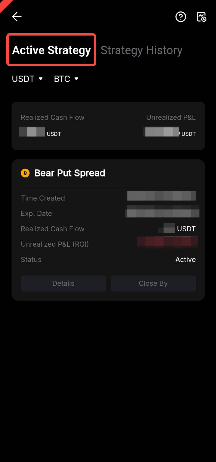 Puede ver los detalles de su estrategia actual en Estrategia activa. Estos incluyen Flujo de caja realizado (sumas de los premium pagados y recibidos), PyG no realizado para todas las estrategias activas, e información sobre cada estrategia.