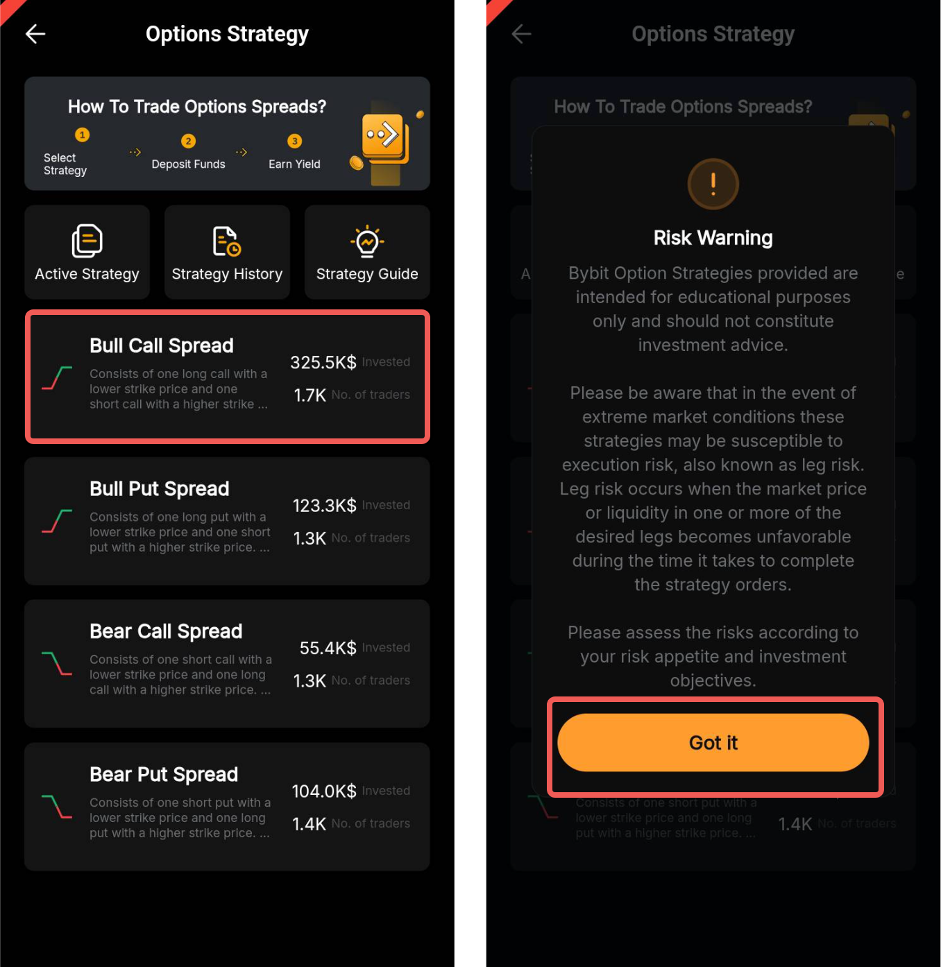 Si es nuevo en la Estrategia de opciones, aparecerá un aviso de Advertencia de riesgo. Lea atentamente el aviso y pulse en Entendido para continuar.
