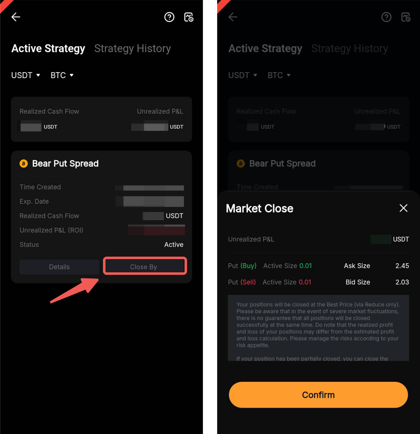 Su estrategia de opciones se cerrará con una orden de mercado. Tenga en cuenta que bajo condiciones de mercado extremas, la iliquidez en el mercado puede hacer que las estrategias de cierre fallen.