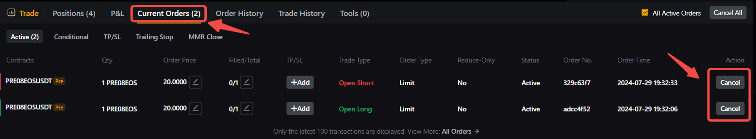 Para cancelar, vaya a la pestaña Ordenes actuales y haga clic en el botón Cancelar.
