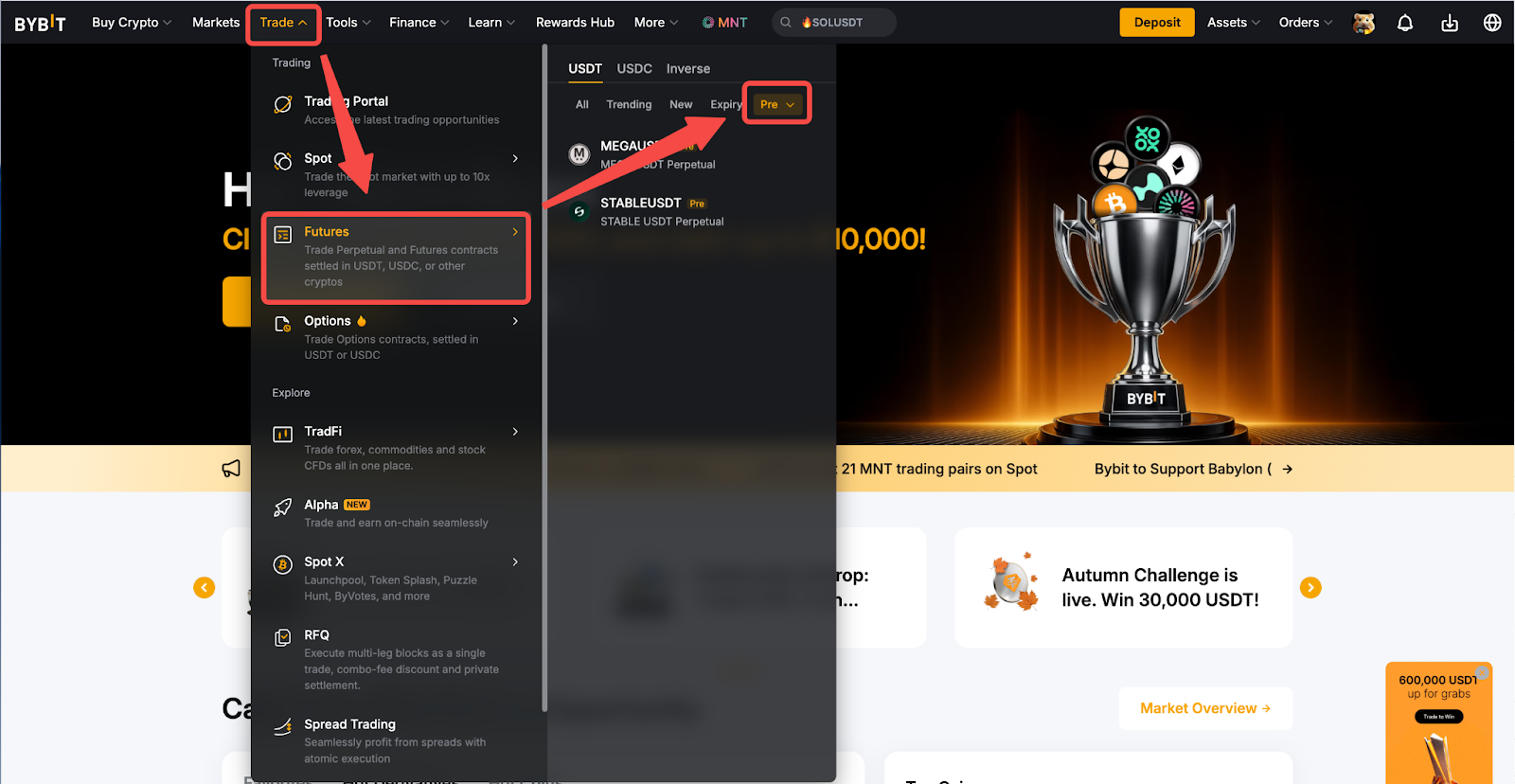Paso 1: Vaya a la sección trading en la barra de navegación, pase a Futuros y haga clic en Pre para ver los contratos de perpetuos previo al mercado en curso.